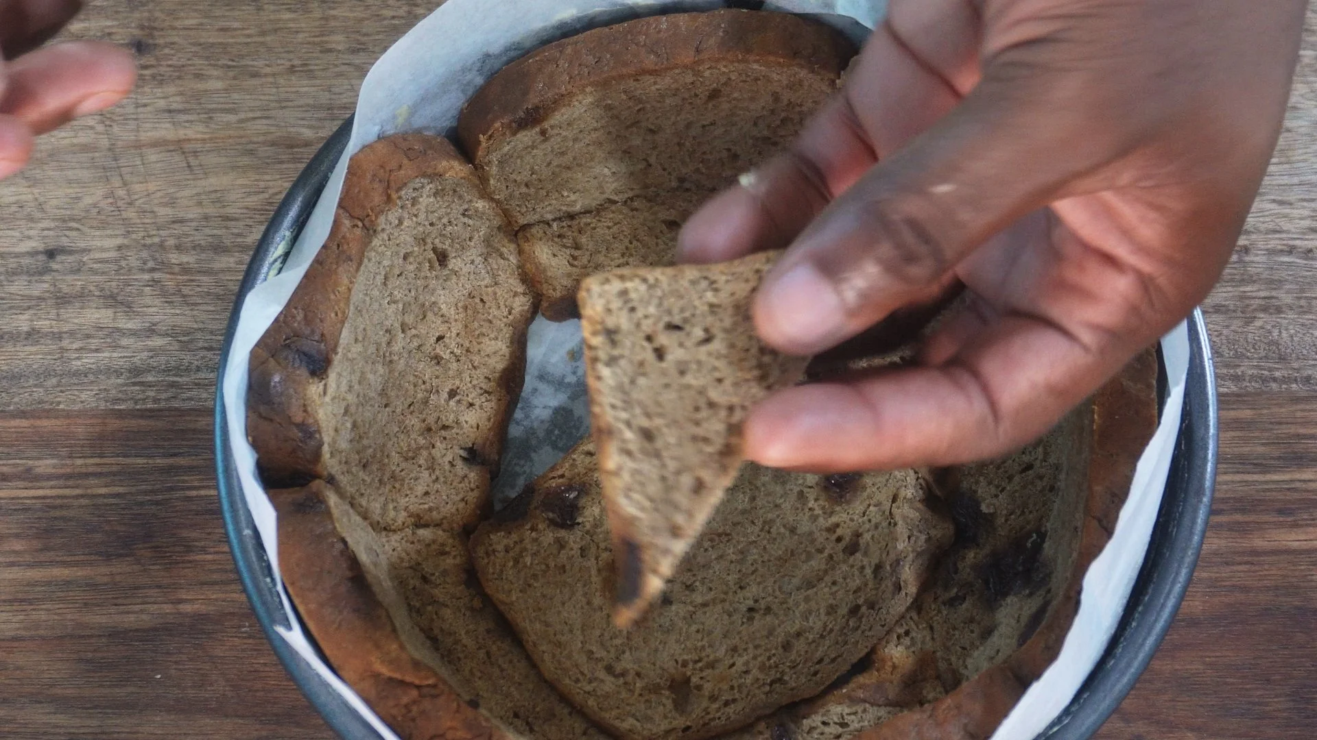 Slice bun into ½-inch slices. Press slices around the sides and bottom, bending the bottom edge to form an L-shape. Fill gaps with small pieces so the crust is snug.