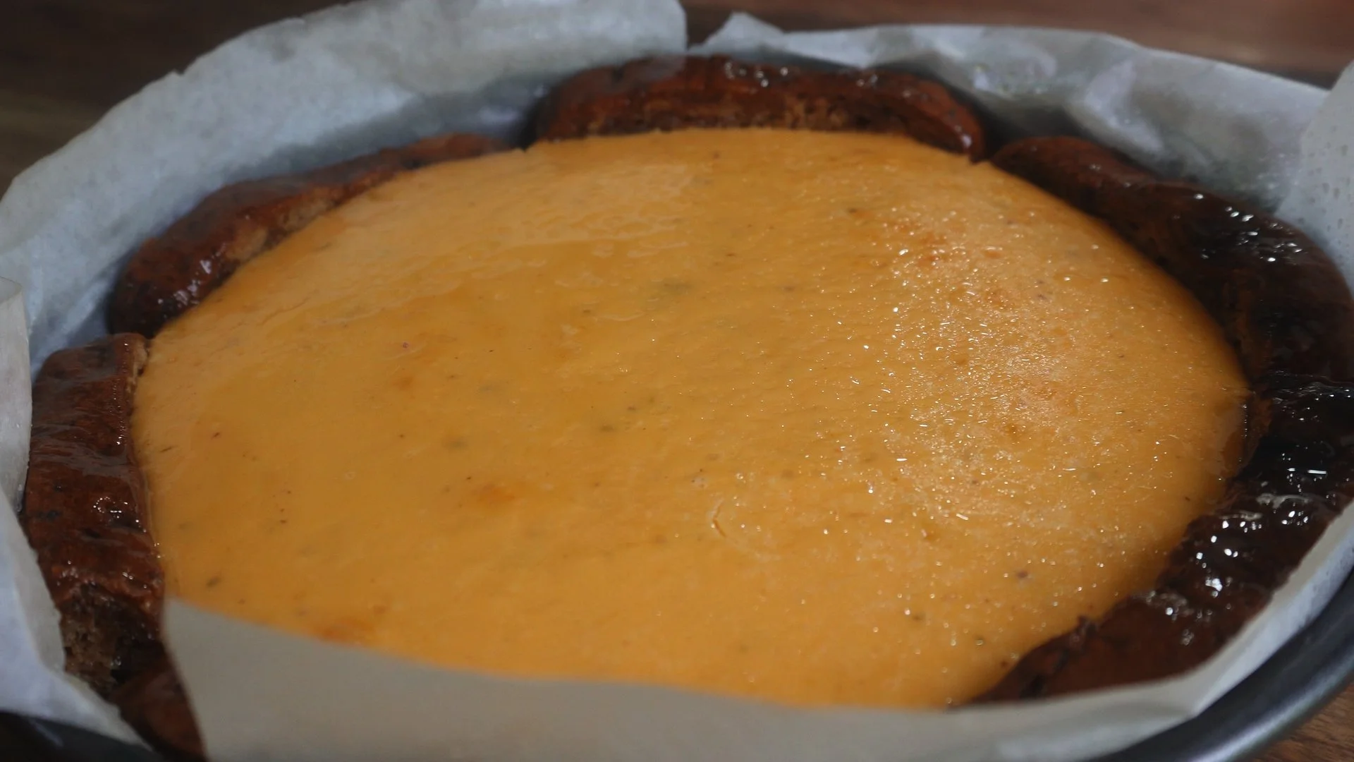 Pour filling into bun crust. Place pan in a larger baking tray with hot water (water bath).