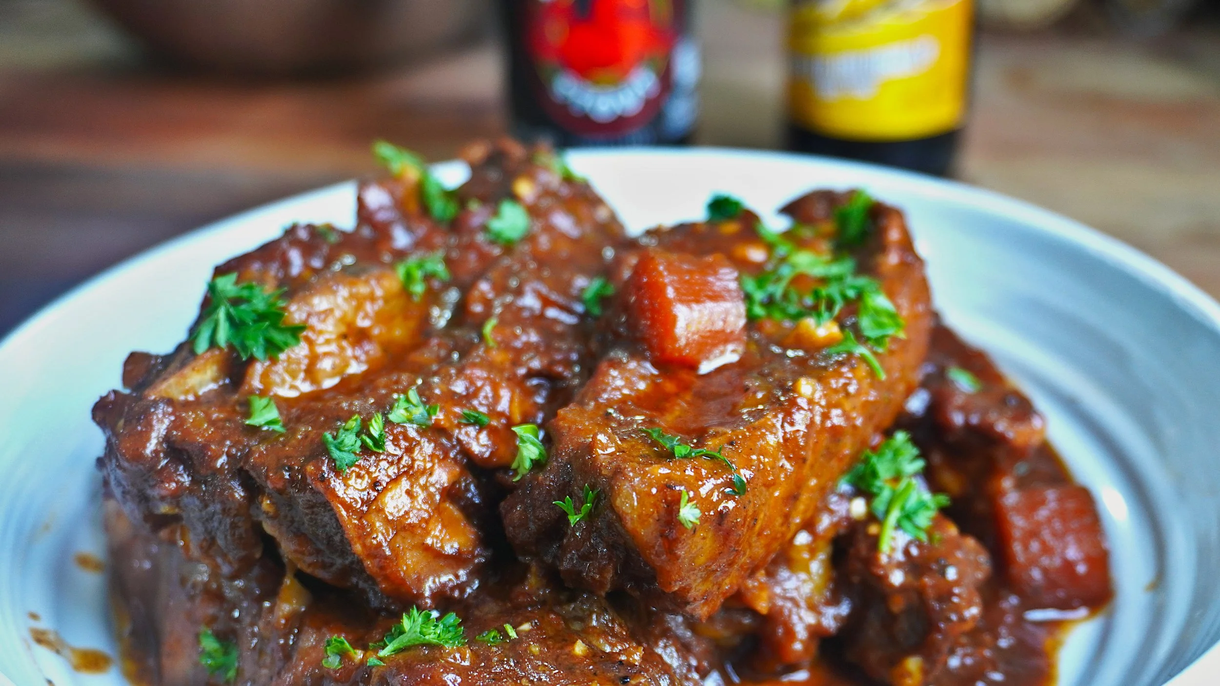 We start by giving the short ribs a proper sear to lock in flavor, then build our braising liquid with fresh aromatics, a bottle of Dragon Stout, and just enough stock to keep things juicy. Slow cooking breaks down the collagen, giving you tender beef and a gravy that’s packed with savory goodness.